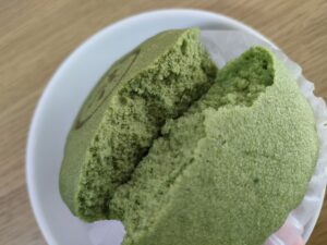 袋を開けた瞬間に抹茶の香りがしっかりとあり、蒸しケーキをちぎるとまた香ります。